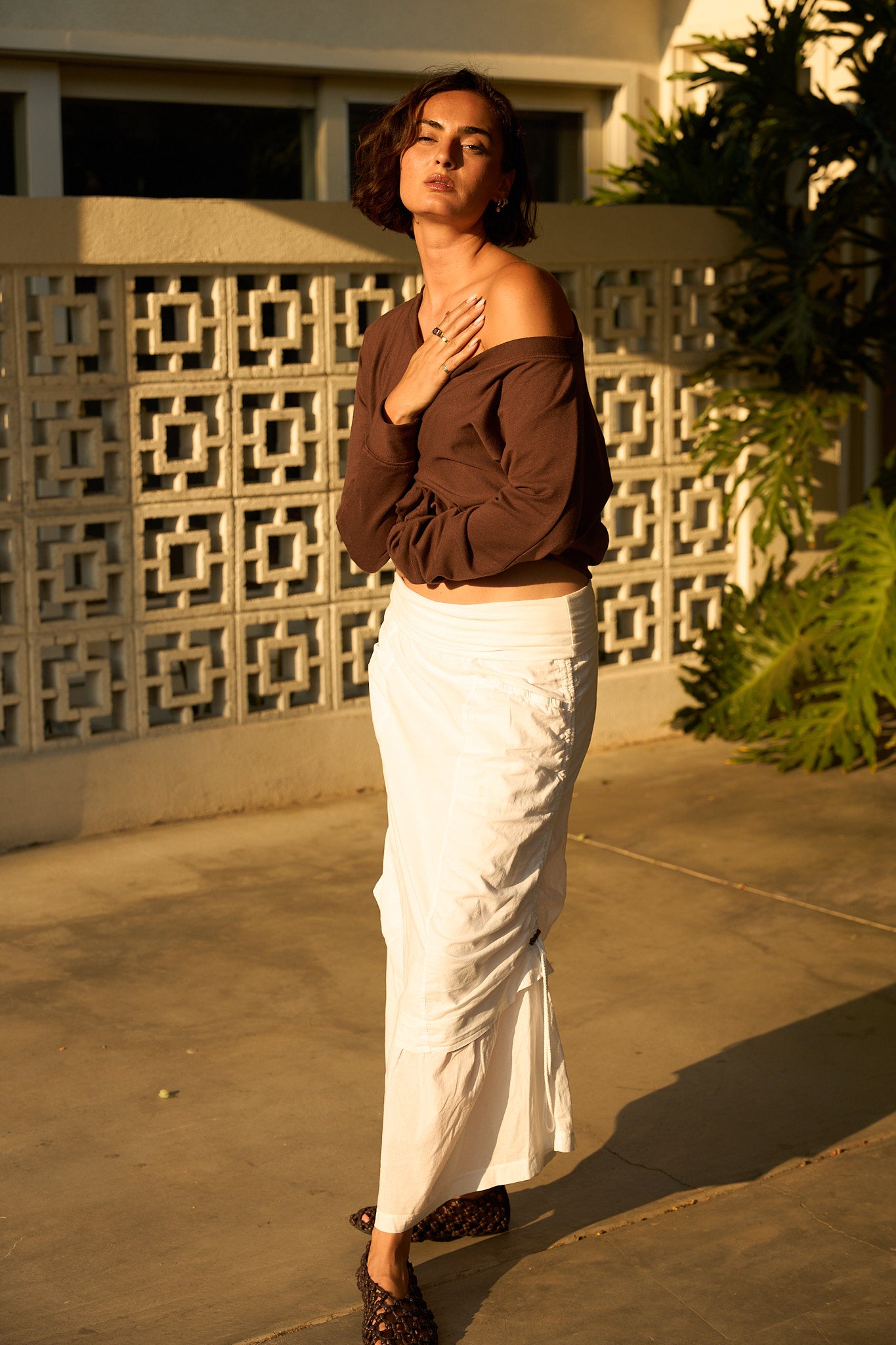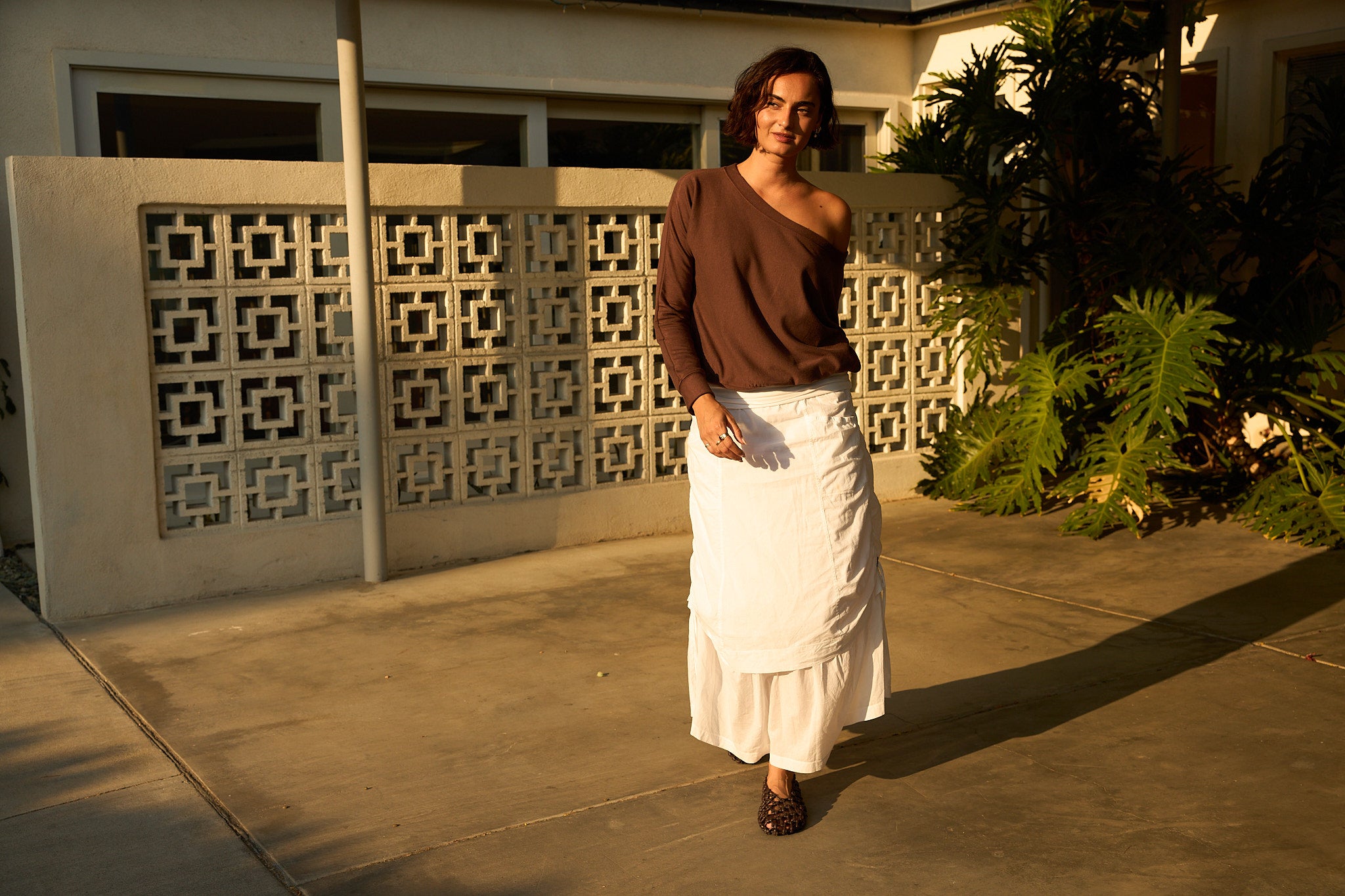 Susan looks effortlessly elegant in the Masai Mara in Bone, showcasing how timeless, neutral tones highlight natural beauty and relaxed confidence. She embodies the ease and refinement at the heart of Eco-Luxe style.