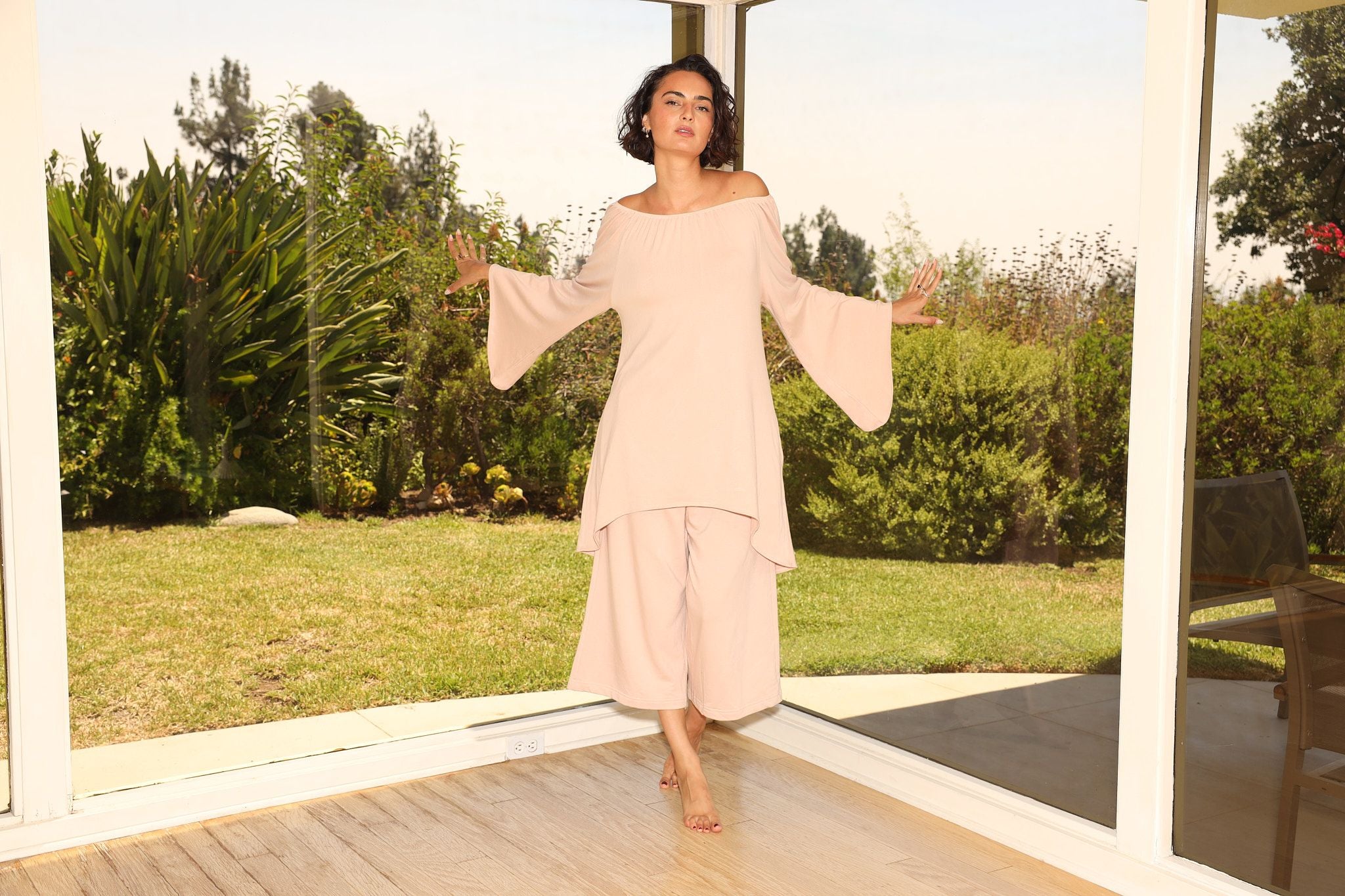 Maddy looks radiant in Rose Quartz with Bone, and Jenna wears Fern with Bone effortlessly. Together, they show how Eco-Luxe pieces flow gracefully with each individual — flattering, comfortable, and beautifully personal.